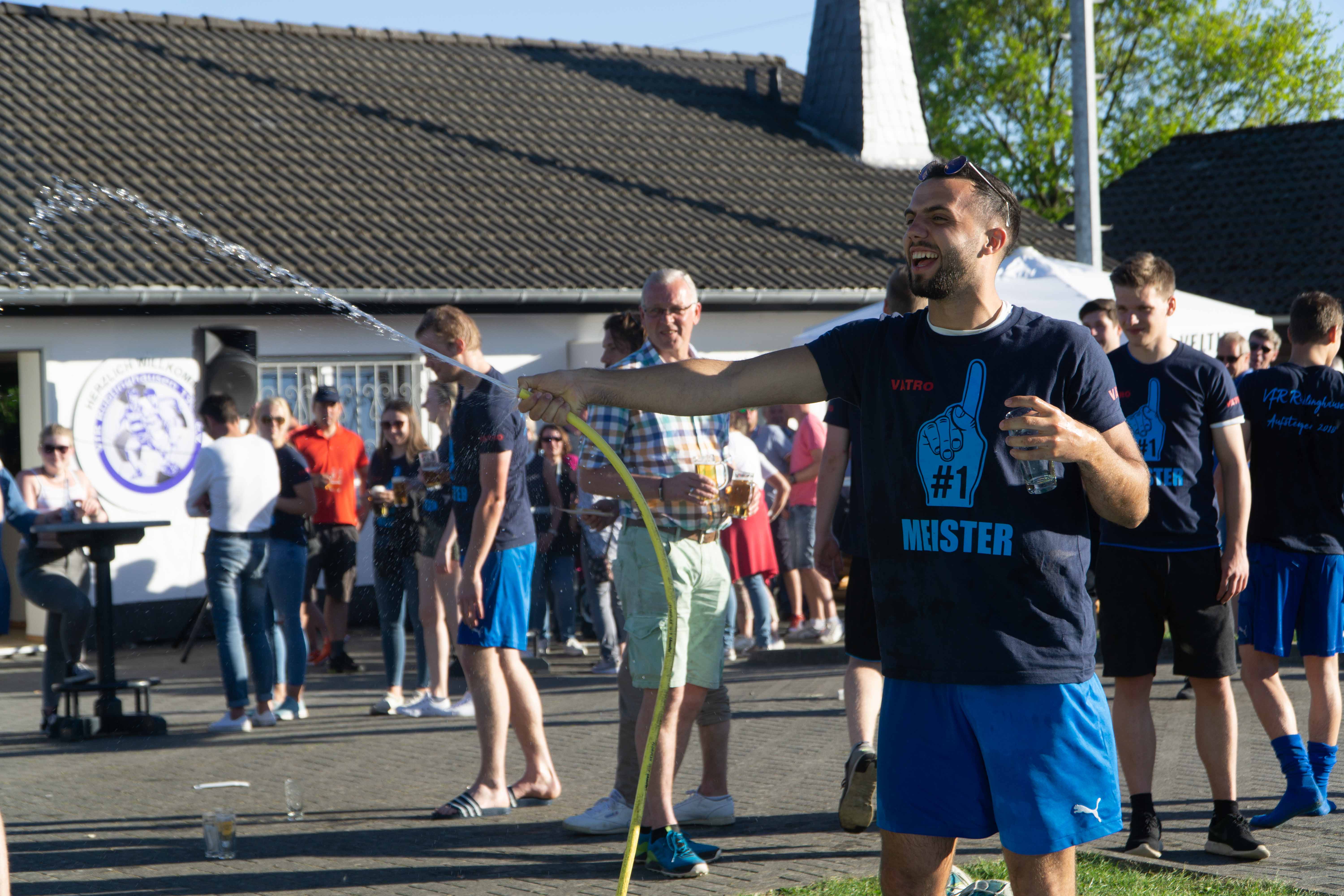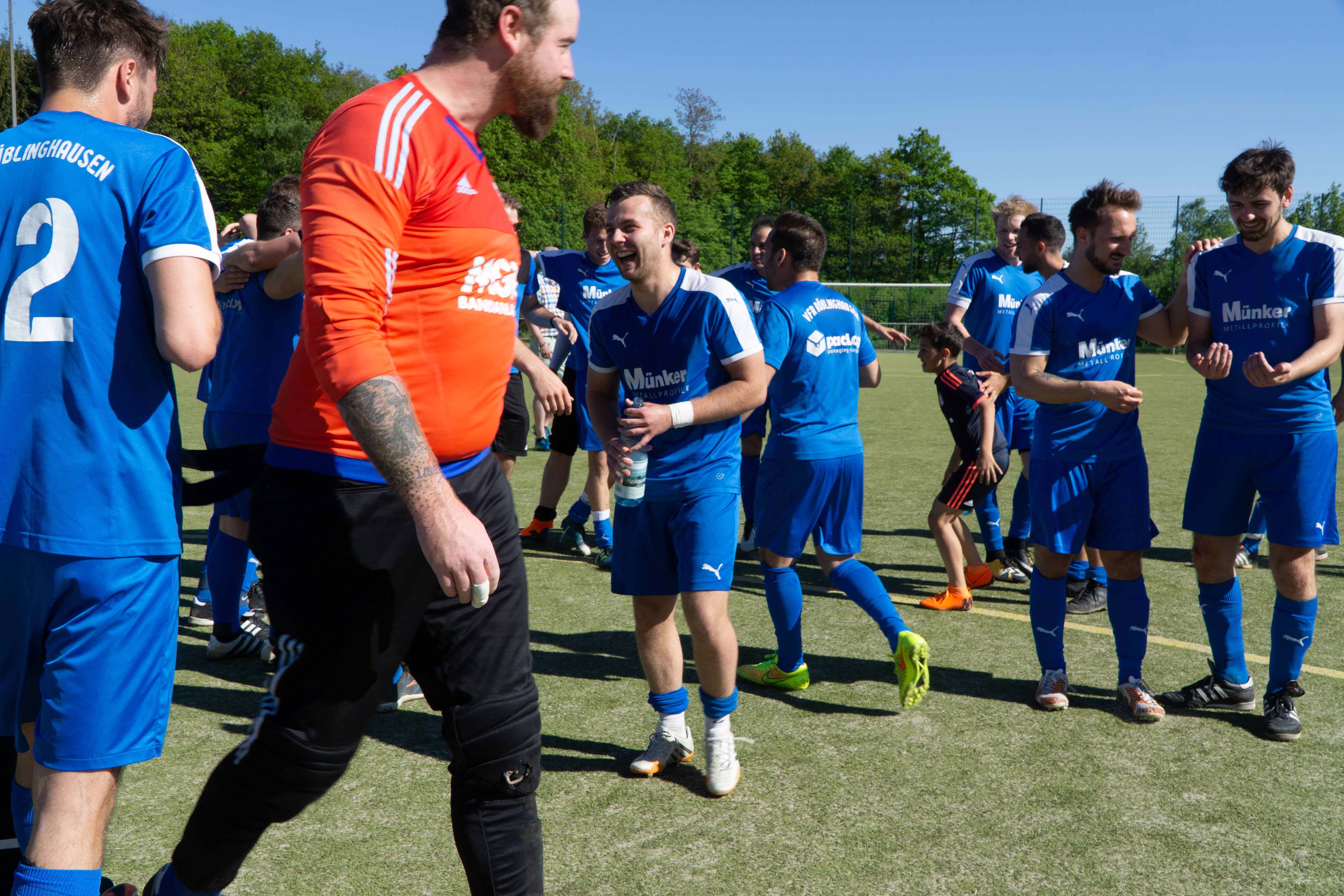 Als die Mannschaft aus der Kabine kam, sah man sofort die Entschlossenheit und die Gier hier heute eine Party zu veranstalten. Philipp Scholz (48. Minute), Evgenij German ( 50. Minute) und Mentor Hajdari (59. Minute) sorgten dafür das schon während des Spiels gefeiert werden konnte. Das Rhode noch zwei Tore erzielte nahm man nur noch zur Kenntnis. Mentor Hajdari machte dann seinen Hattrick in der 90. Minute perfekt und mit dem Tor beendete der Schiedsrichter die Partie. Fans und Spieler rannten auf den Platz und feierten.[fvplayer src=“https://vfr1909-rueblinghausen.de/wp-content/uploads/2018/05/MAH06579.mp4″ width=“1440″ height=“1080″]
